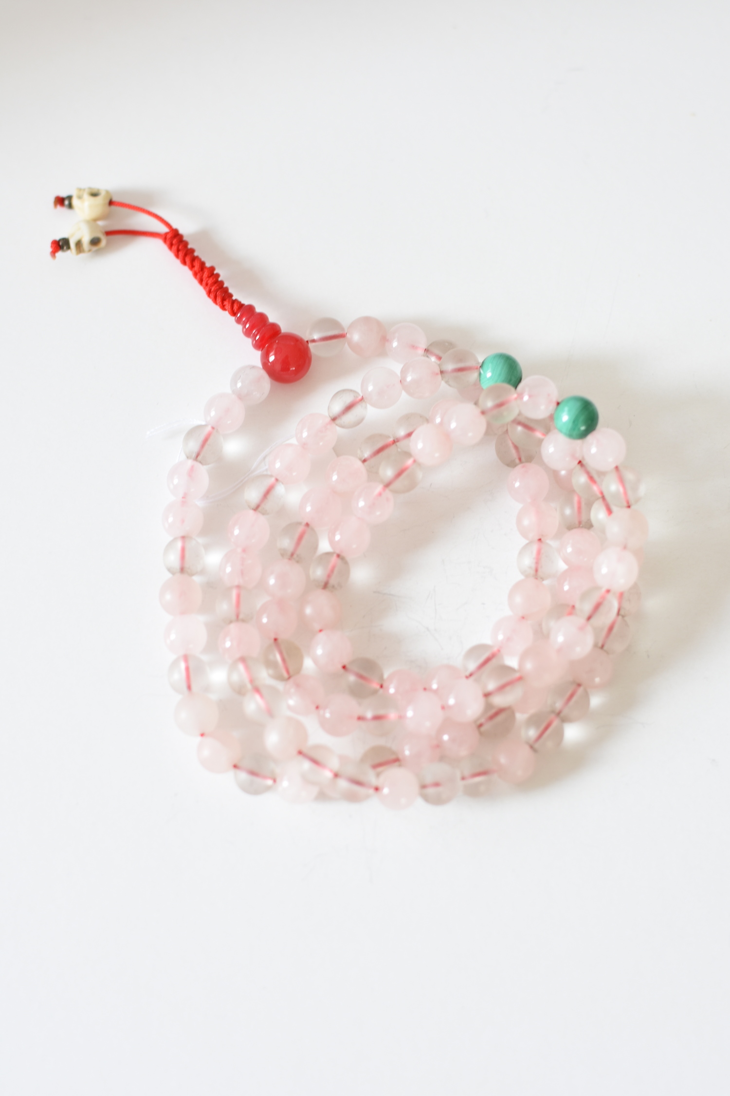 Mala aus Rosenquarz – auch Bergkristall, Rauchquarz. Rosenquarz ist ein Herz-Kristall, es beflügelt Beziehungen, wehrt negative Energien ab (Elektrosmog) und die Farbe macht einfach froh.