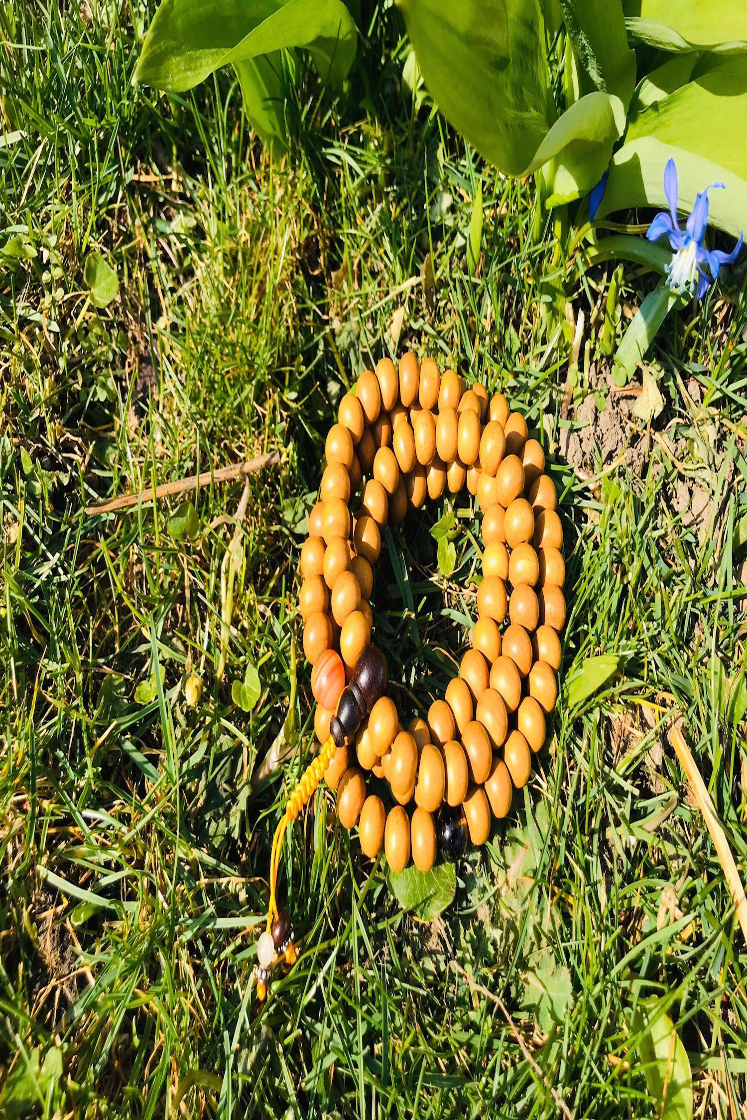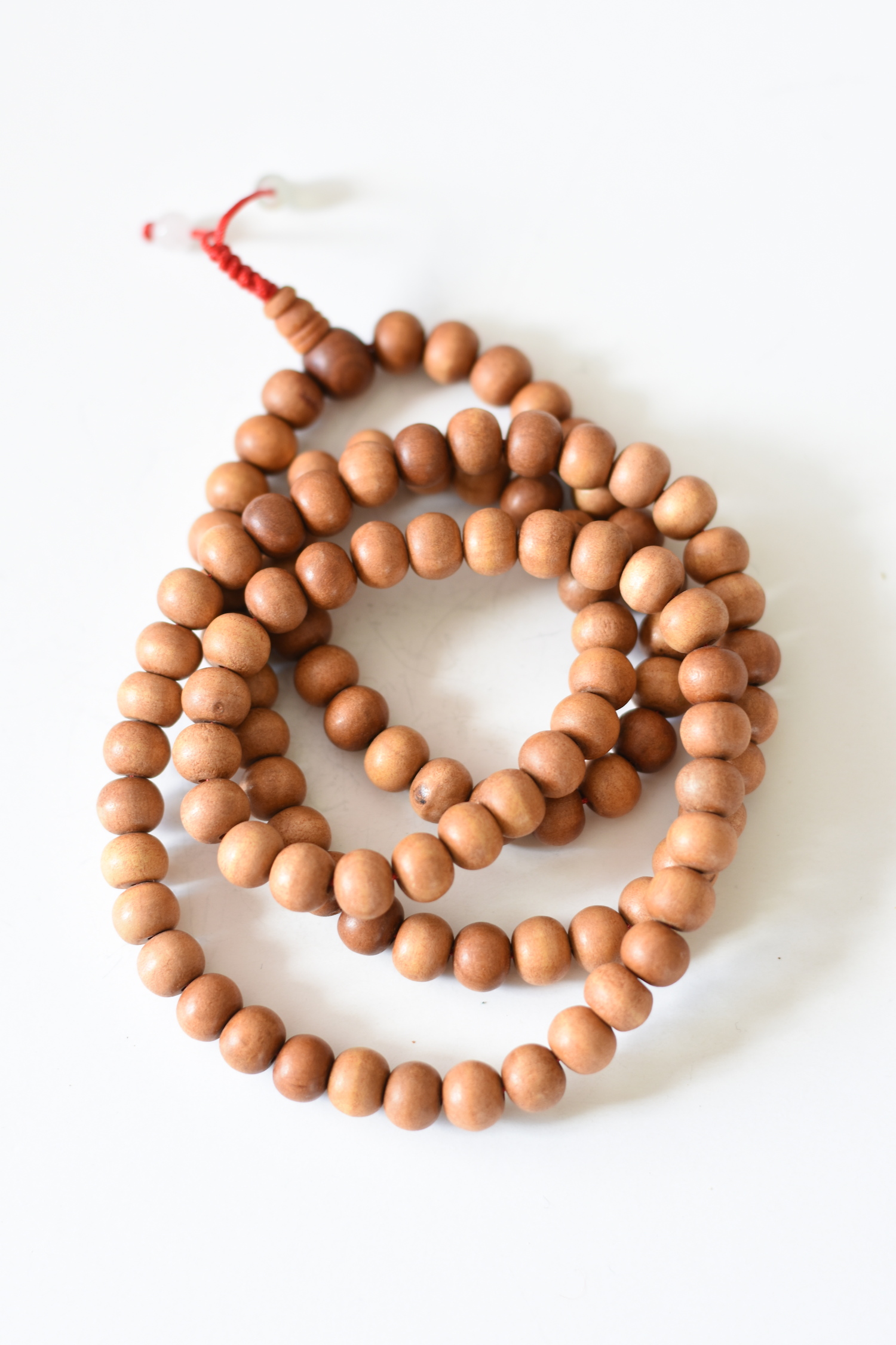 Klassisches Mala mit Sandelholz-Perlen und echten Mineralsteinen. Unsere hauseigenen Mala-Designs sind sehr beliebt und bestehen aus den Sandelholz-Perlen sowie zierenden, echten Mineralsteinen (Farben und Arten können von der Abbildung abweichen) – so wird jedes Mala ein Unikat und ist individuell mit viel Hingabe von Hand hergestellt.