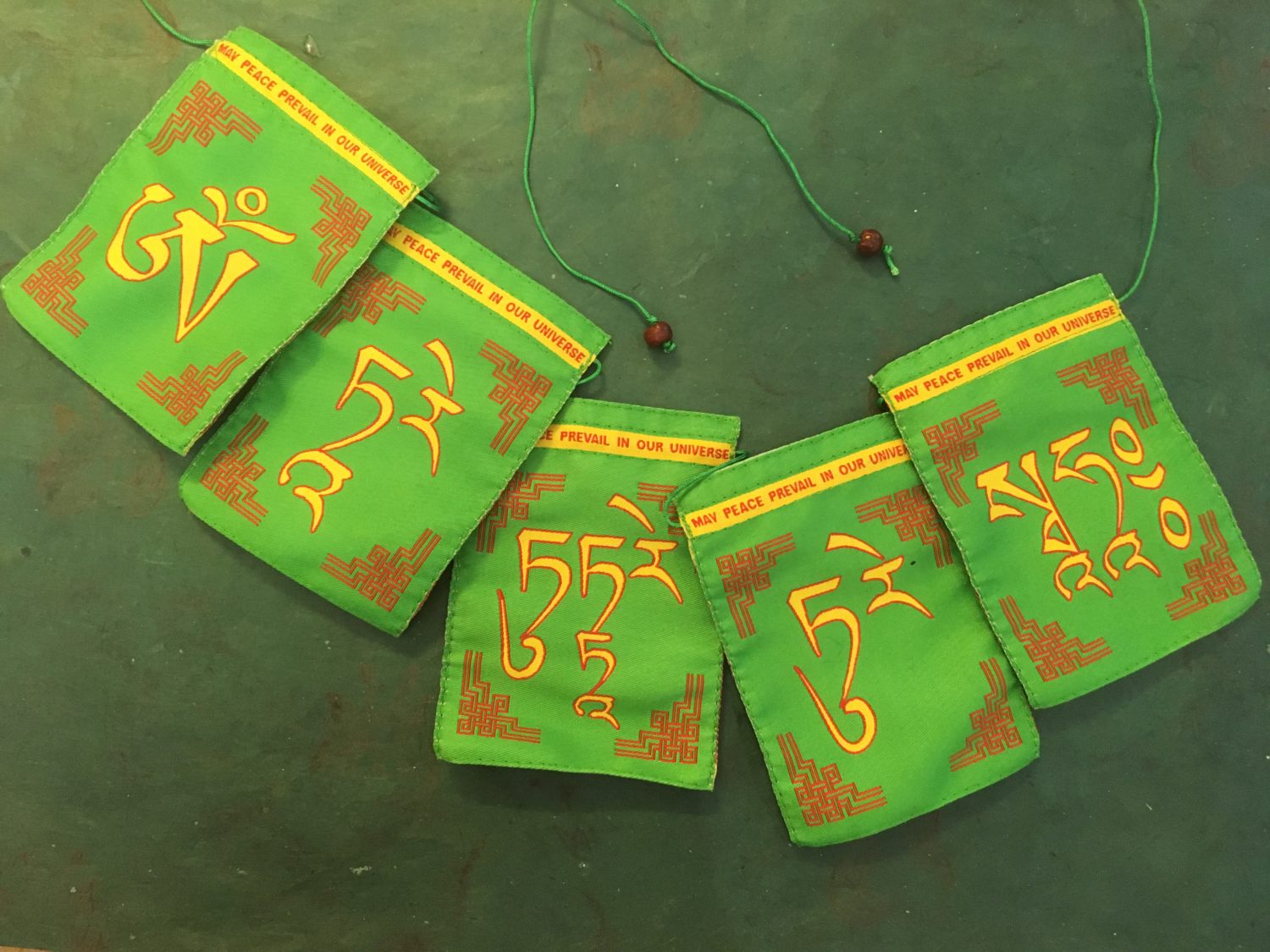 Hochwertige Tara Mantra-Fähnchen, in grün mit Goldgelber Schrift, in tibetisch.